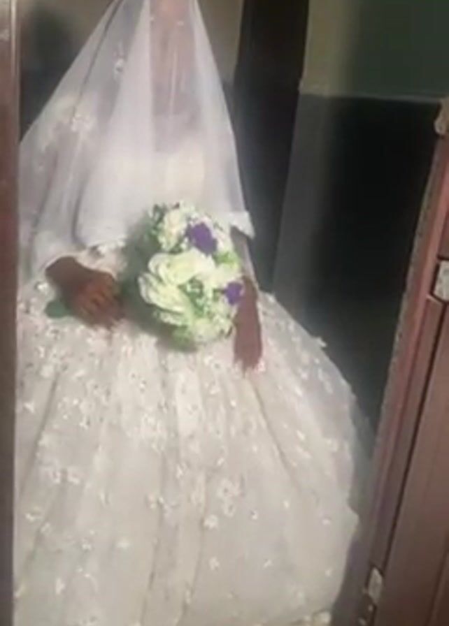 A bride stands in an entryway, wearing a large, heavily ornamented white ballgown and a long, translucent white veil. She holds a bouquet of white and purple flowers. The entryway is framed by a dark brown doorframe and a wall painted in two tones, with a darker shade above and a lighter shade below. The lighting is dim. The camera remains static, capturing a full shot of the bride.