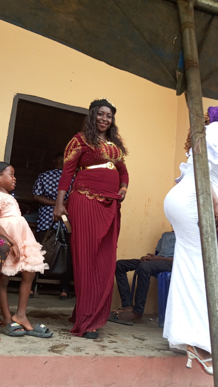 This image captures a group of individuals near a building in Agburu Uke, Nigeria. In the foreground, a woman stands centrally, facing the camera with a slight smile. She wears a long-sleeved, maroon top with gold embellishments, a pleated maroon skirt or wrapper, and a gold belt with a central ornament. A black crown or headpiece adorned with gold detailing sits on her dark, wavy hair. She holds a black handbag in her left hand. To her left, a young girl in a peach-colored ruffled dress stands partially visible, looking away from the camera. Her feet are in black slide sandals. In the mid-ground, behind the central woman, a man in a blue and white checkered shirt is partially visible through a darkened doorway, facing away from the camera. To the right of the central woman, another person, largely obscured, is visible in a white garment, with only their right side and leg in a white high-heeled sandal visible. Further to the right, a man sits on a blue plastic stool, wearing dark trousers and a dark shirt, with black slide sandals on his feet. The setting appears to be outdoors, in front of a single-story building with a light yellow wall and a dark brown or black trim around a doorway. The ground consists of a concrete slab with a reddish-brown edge, showing some discoloration. An overhead structure, possibly a canopy or awning supported by wooden poles, is visible in the upper right quadrant of the image. The lighting suggests daylight conditions.