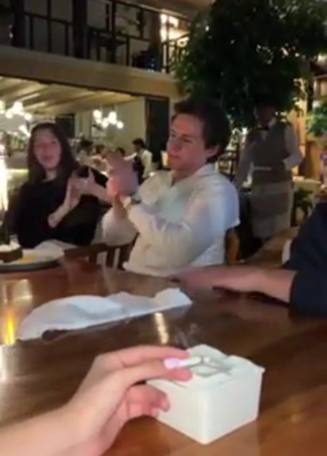 four people at a wooden table in what appears to be a restaurant or bar. Three people are seated around the table, and the camera is pointed at them by a fourth person. Two of the people seated, a woman on the left and a man in the middle, clap their hands. The person on the right is mostly out of frame, with only their forearm visible. In the foreground, the person holding the camera has a hand resting on the table, holding a cigarette near a square white ashtray. The background is a dimly lit establishment with other patrons and wait staff visible. There are plants and decorative lighting in the background, including a mezzanine level above the main floor.