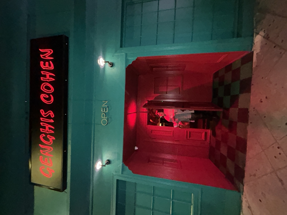 A restaurant's entrance is captured at night. The restaurant, named "Genghis Cohen," is marked by a vertical neon sign in red. The exterior is a vibrant teal color, contrasting with the red interior. The entrance resembles a doorway with a checkered floor. "Open" is written horizontally in gold near the entrance. Two light fixtures illuminate the entrance. The interior reveals a glimpse of the bar area with people inside.