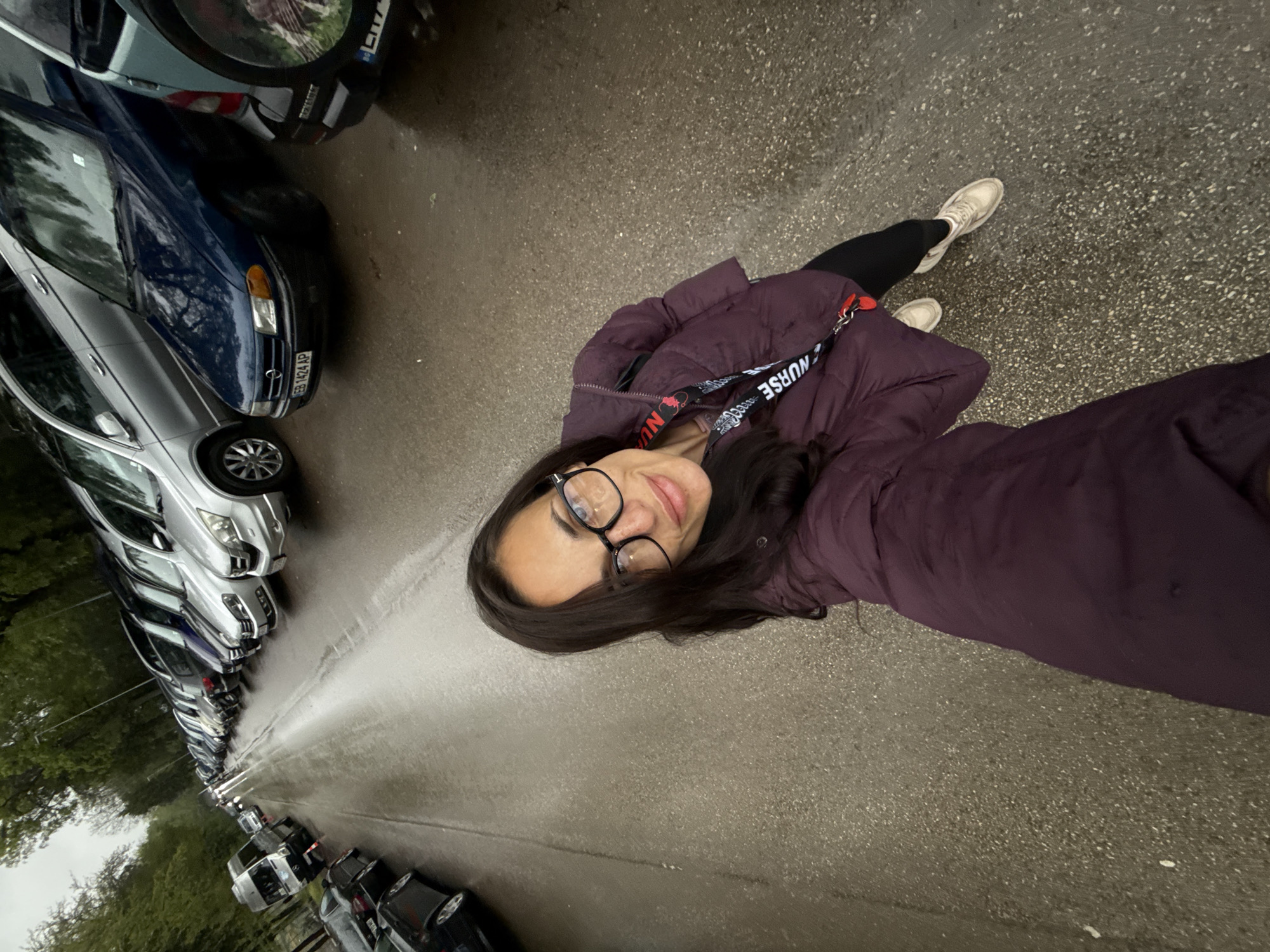 A woman with glasses poses in a selfie on a wet street. She is wearing a puffy purple jacket, black leggings, and white sneakers. Cars are parked in a row on one side of the street, reflecting in the water on the asphalt. The perspective is tilted, giving the impression of looking down a long, wet avenue. The scene appears to be outdoors on a cloudy day.