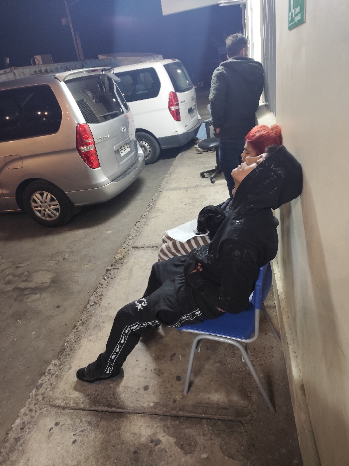 The image depicts an outdoor, nighttime scene in the city of Iquique, Chile. In the foreground, a person with red hair, wearing a black hooded sweatshirt, black track pants with white designs, and black sneakers, is seated on a blue plastic and metal chair. This individual leans against a light-colored wall, their head tilted back and to the right, with their right hand near their ear. A striped object, possibly a cushion or bag, is positioned behind them on the chair. Further back and to the right, a second individual, appearing male with dark hair, stands facing the building wall with their back mostly to the camera. They are wearing a dark, textured jacket and dark pants, positioned near a dark office-style chair on wheels. Parallel to the wall, two minivans are parked on a concrete surface. The closest vehicle is a silver Hyundai H1 or similar model, displaying a Chilean license plate (partially visible). Behind it, a white minivan of a similar make and model is parked. The concrete ground appears worn and stained. A white sign with a green symbol, resembling an emergency exit sign, is visible on the wall above the standing person. The scene is illuminated by artificial light, suggesting an urban or commercial area at night.