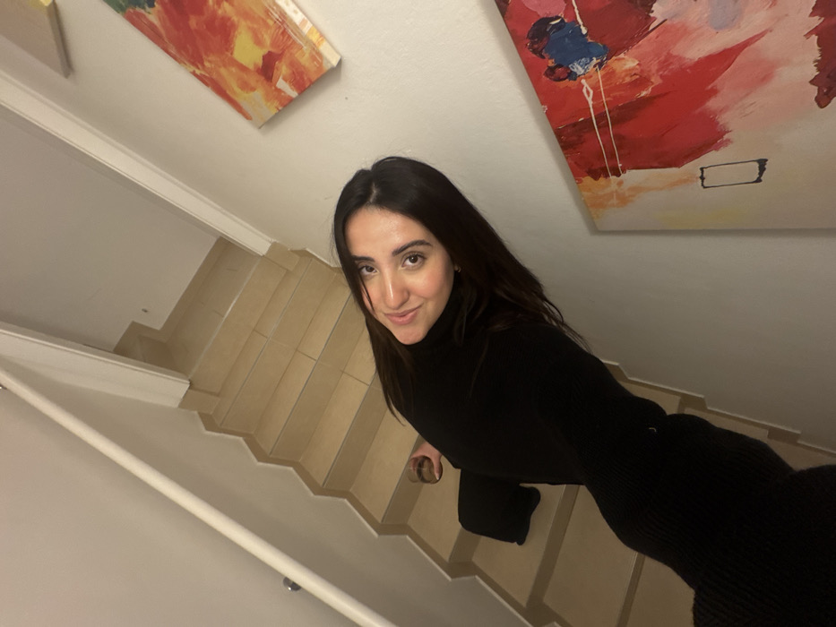 A woman with long, dark hair and a black turtleneck sweater poses on a staircase. The stairs are covered in beige tiles. Two abstract paintings adorn the white wall above. One painting is predominantly red with blue accents, while the other displays yellow and orange hues. A white handrail is visible on the left side of the frame.