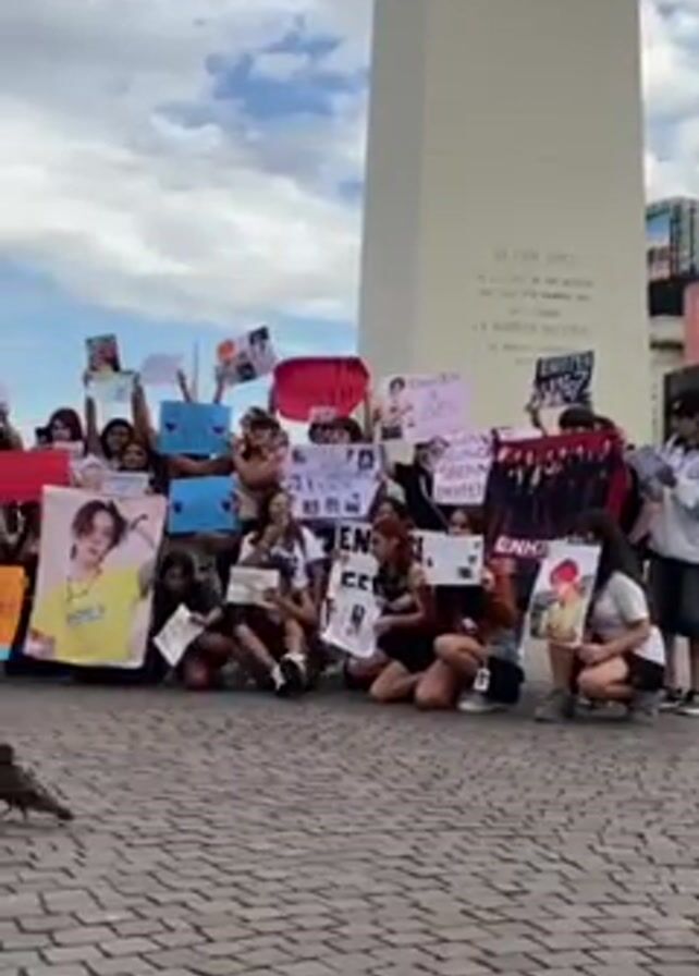 A group of young people are kneeling and squatting in a plaza, holding up signs and pictures in front of them. They are facing forward, and one person to the side seems to be reading from a paper. In the background, there is a tall, white obelisk-like structure with inscriptions on it. The plaza is paved with brickwork in a herringbone pattern. Above them, the sky is partly cloudy. A bird walks in the foreground, seemingly unfazed by the group.