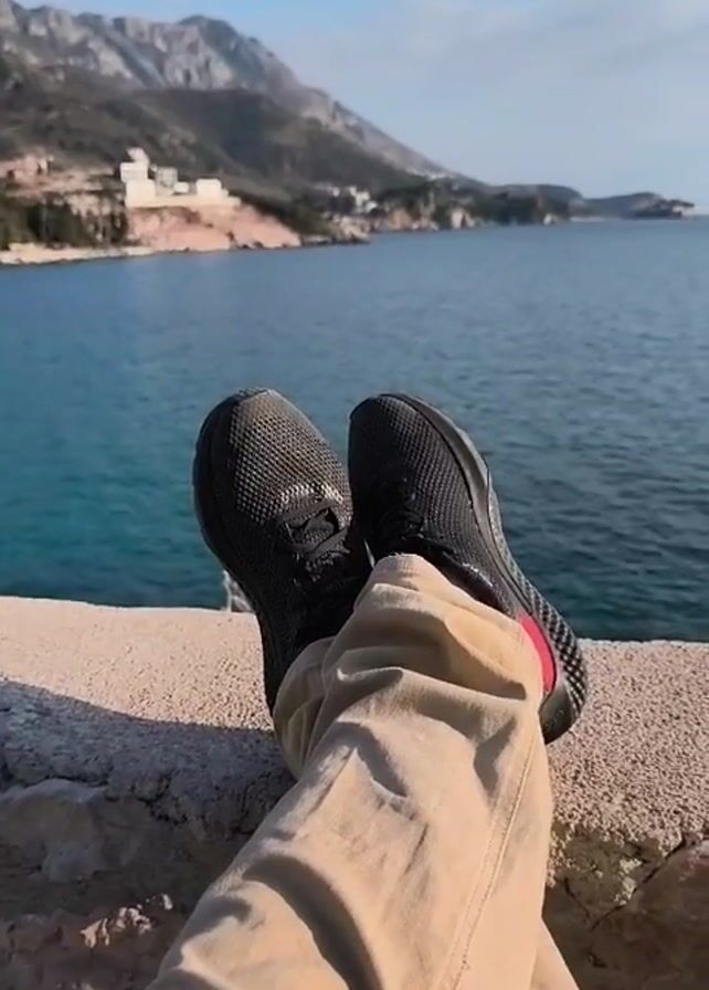 A first-person perspective shot shows a person sitting with their legs crossed at the ankles, resting on a stone wall. The person is wearing khaki-colored pants and black sneakers with red accents on the heels. The background features a scenic view of a blue ocean, with mountains and buildings visible on the opposite shore. The sky is blue with scattered clouds.