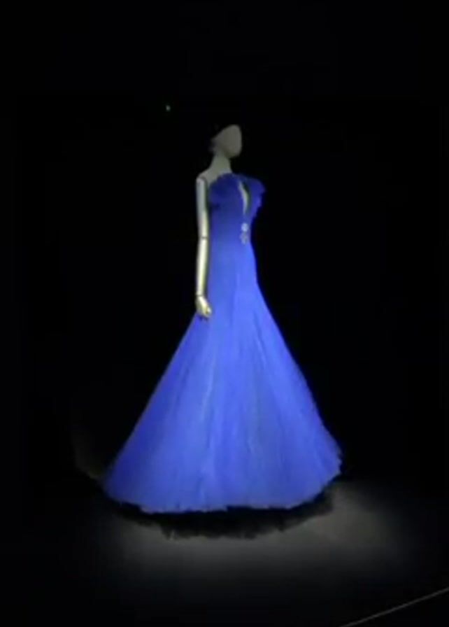 A stationary video shows a full-length blue formal dress displayed on a mannequin in a dark room