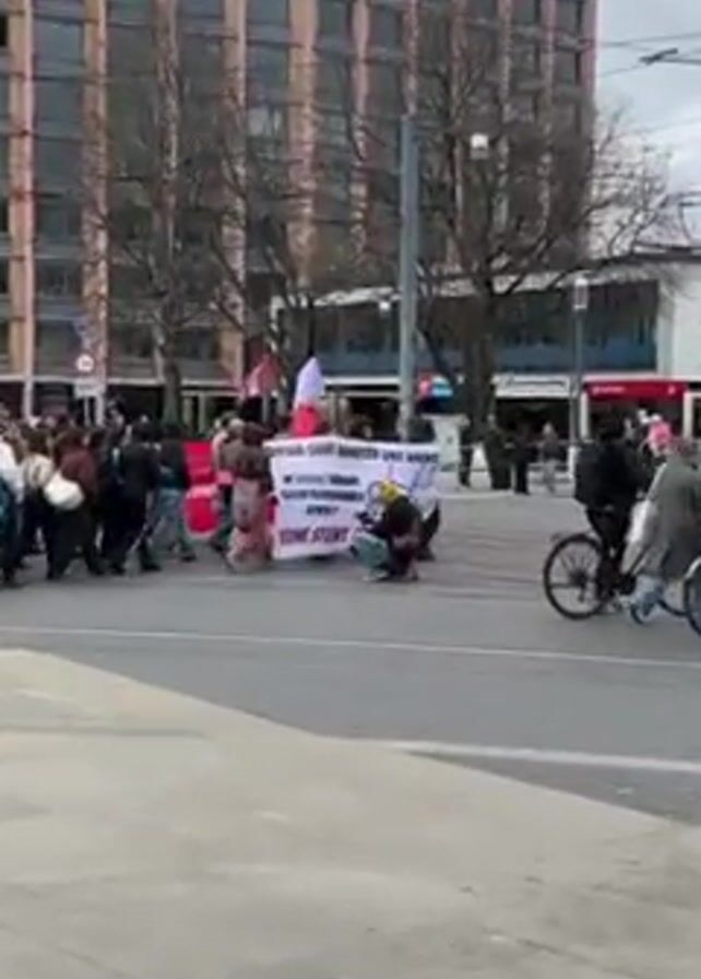 group of people participating in a demonstration or protest. They are carrying a large banner with text written on it, and there are also several flags. One person is kneeling in front of the banner. The setting appears to be an urban area, with buildings, streets, and trees visible in the background. Some people are riding bicycles in the vicinity. The sky is overcast.