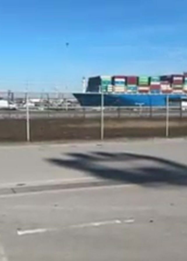 cargo ship loaded with colorful containers in the background, separated by a fence and a small patch of grass. The foreground shows an empty road with a dark shadow that seems to be in motion, perhaps cast by a moving object, although the object itself is not visible in the frame. There are industrial cranes visible in the distance on the left, suggesting that this is a port area. The sky is clear and blue.