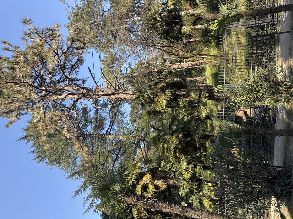 The image depicts an outdoor scene within a park or botanical garden under a clear blue sky. In the foreground, a dark metal fence, possibly wrought iron with decorative motifs, spans horizontally across the lower half of the frame. A paved walkway is partially visible to the left of the fence. A person, largely obscured by foliage and the fence, is visible through a partially open gate in the mid-ground. This individual wears a light-colored (tan or brown) jacket and dark trousers; facial features are not discernible. Behind the fence, the landscape gently slopes uphill, covered by dense vegetation. Numerous palm trees, characterized by fan-shaped fronds and sturdy trunks, are prominent throughout the scene, interspersed with taller coniferous trees, likely pines, some exhibiting sparse or yellowish-brown needles. Other deciduous trees and various green shrubs and bushes fill the undergrowth. At least two thin, dark cables or wires are visible horizontally strung between the taller trees in the upper-middle section of the image. The upper portion of the frame features a clear, bright blue sky. The specific combination of tall pines, abundant palm trees, and the park-like setting is consistent with the **Sochi Arboretum (Dendrarium)**, located in the Central District of Sochi, Russia.