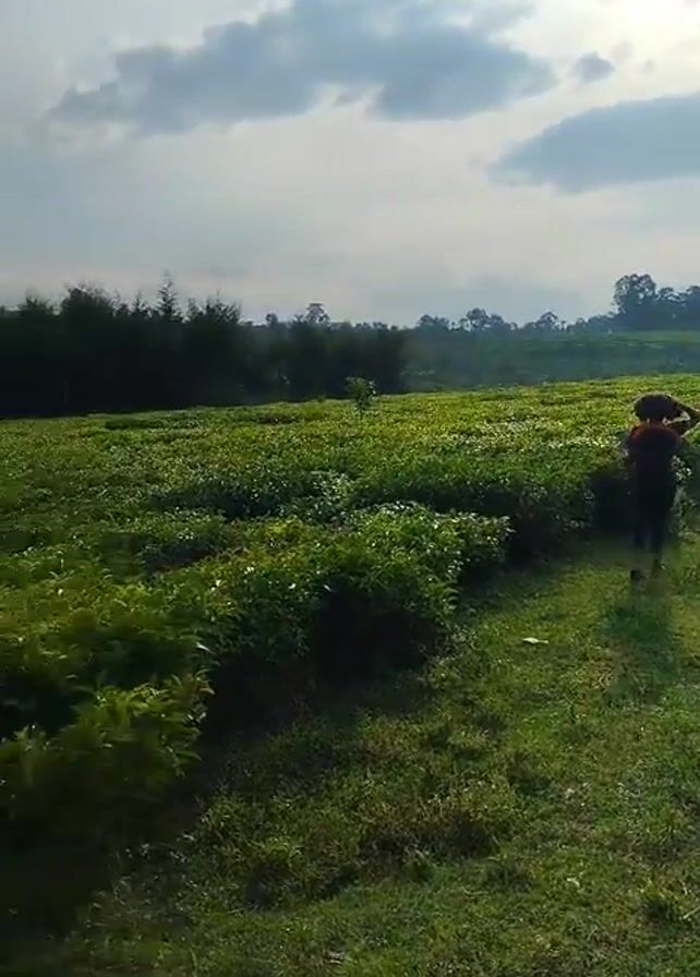 tea plantation under a cloudy sky. Initially, a person wearing dark clothing and a wide-brimmed hat is walking away from the camera through the rows of tea bushes. The camera then pans across the plantation, revealing its expanse, the dark tree line in the background, and the green grass growing alongside the bushes. The sky is partly cloudy, with the sun shining through at times. As the camera continues to pan, a dirt road is revealed next to the tea field, as well as a tall green tree.