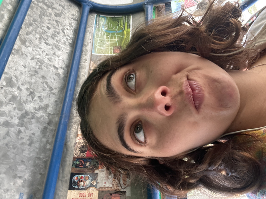A selfie-style close-up captures a woman with brown, curly hair. Her eyes are wide, and her lips are pursed slightly, creating a playful expression. Her face appears angled to the side. The background includes a blue metal structure and various items. A map and images of food are subtly visible, contributing to a casual atmosphere. The lighting is natural.