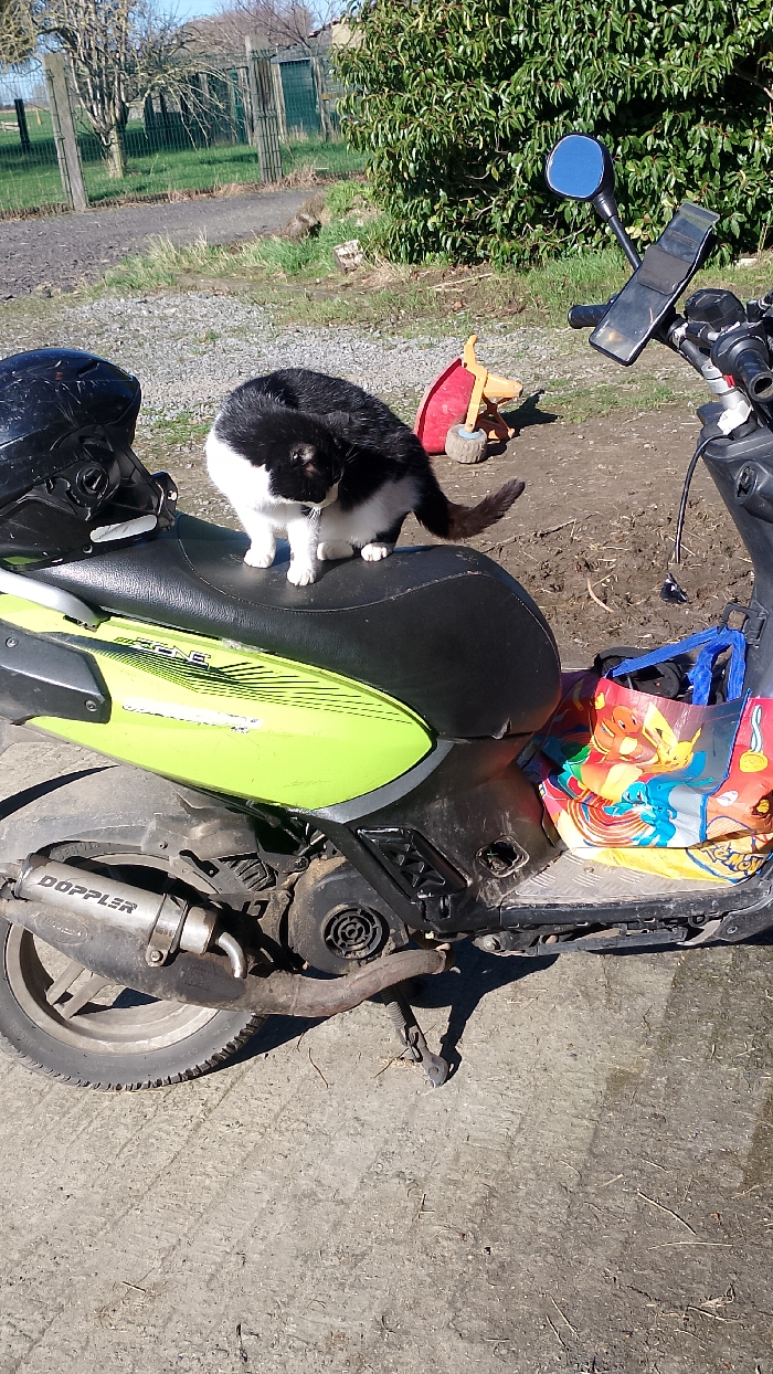 The image displays a bicolored black and white domestic cat positioned on the black seat of a motor scooter. The cat's body is predominantly black with white fur on its chest, belly, and paws; its head is slightly tilted to the left. The scooter, primarily dark-colored, features a lime-green side panel on the left, an aftermarket silver "DOPPLER" exhaust pipe, and a black helmet resting on the front of the seat. A black rearview mirror and a black smartphone mount are visible on the right handlebar. A colorful shopping bag, depicting cartoon characters, is placed in the scooter's right footwell. The scooter is resting on its kickstand. The scene is an outdoor, unpaved area. The ground consists of sun-drenched dirt and gravel, with scattered dry debris and visible tire tracks. In the background, a wire fence separates the foreground from a higher elevation featuring sparse, dormant deciduous trees and dense green bushes. A small red and yellow child's toy with blue wheels is situated on the ground behind the scooter. The lighting indicates bright natural sunlight. The precise location within Tournai, Belgium, is not identifiable from the image, but the rural characteristics of the background suggest an outlying or countryside area. No individuals are present.