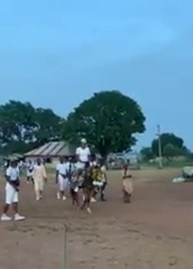 The video depicts a grassy field with several people gathered. Most are wearing white tops and bottoms. A person in white is riding a decorated horse, being led by another person. A wheelbarrow is being pushed nearby. The sky is overcast, and there are trees and buildings in the background. Some people are walking around, while others are standing.