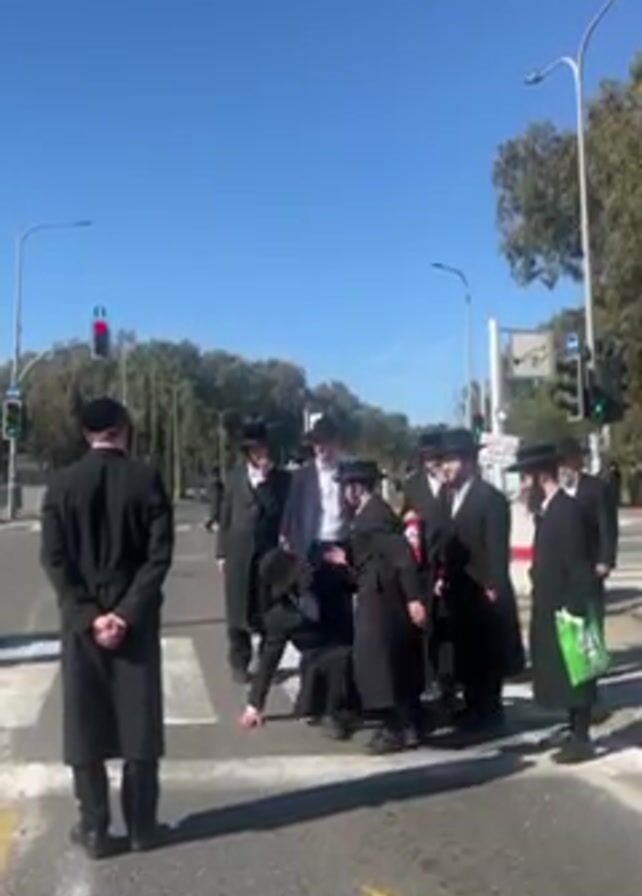 A group of men dressed in traditional Orthodox Jewish attire stand on a crosswalk. One man is on the ground, and others assist him to stand up. The group is surrounded by other men, also in traditional garb. Traffic lights are visible in the background, along with trees and streetlights under a clear blue sky.