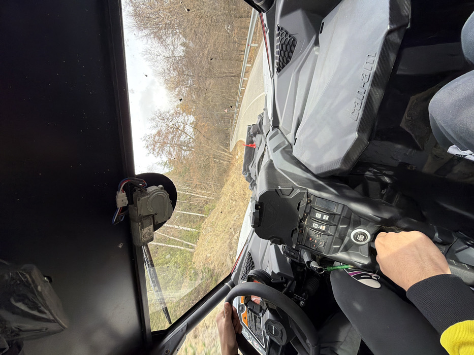 The image provides an interior view from a Can-Am side-by-side utility terrain vehicle (UTV), observed from the passenger side, looking forward