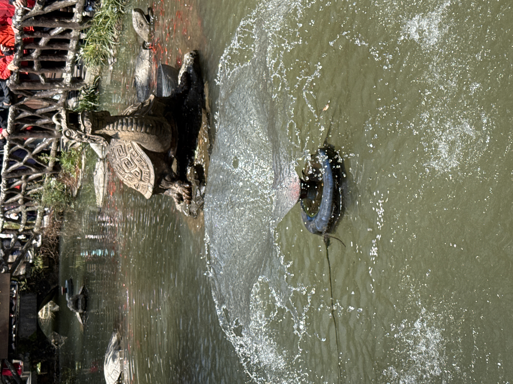 The scene depicts a water feature within the city of Luoguta, China. In the foreground, a dark, circular fountain mechanism is partially submerged in murky green water, actively propelling water upwards in a wide, circular spray. Directly behind the fountain, a large, ornate stone turtle statue with a dragon-like head is positioned on a submerged platform in the midground, facing towards the right. Its shell features intricate carvings, and a small, empty bowl rests near its base. To the left and right of this central statue, several other less defined turtle-shaped stones or submerged statues are visible. Numerous small red fish, possibly goldfish or koi, are scattered throughout the water, particularly dense around the central turtle statue. In the background, a rustic wooden bridge with an arched underside spans the water, supported by stone or wooden piers. A dark, criss-cross patterned wooden railing runs along the bank in the upper right. Several individuals are partially visible behind and on the bridge and railing, with some wearing red jackets. Green vegetation lines the banks and is present under the bridge. The environment appears to be an outdoor setting under bright daylight.
