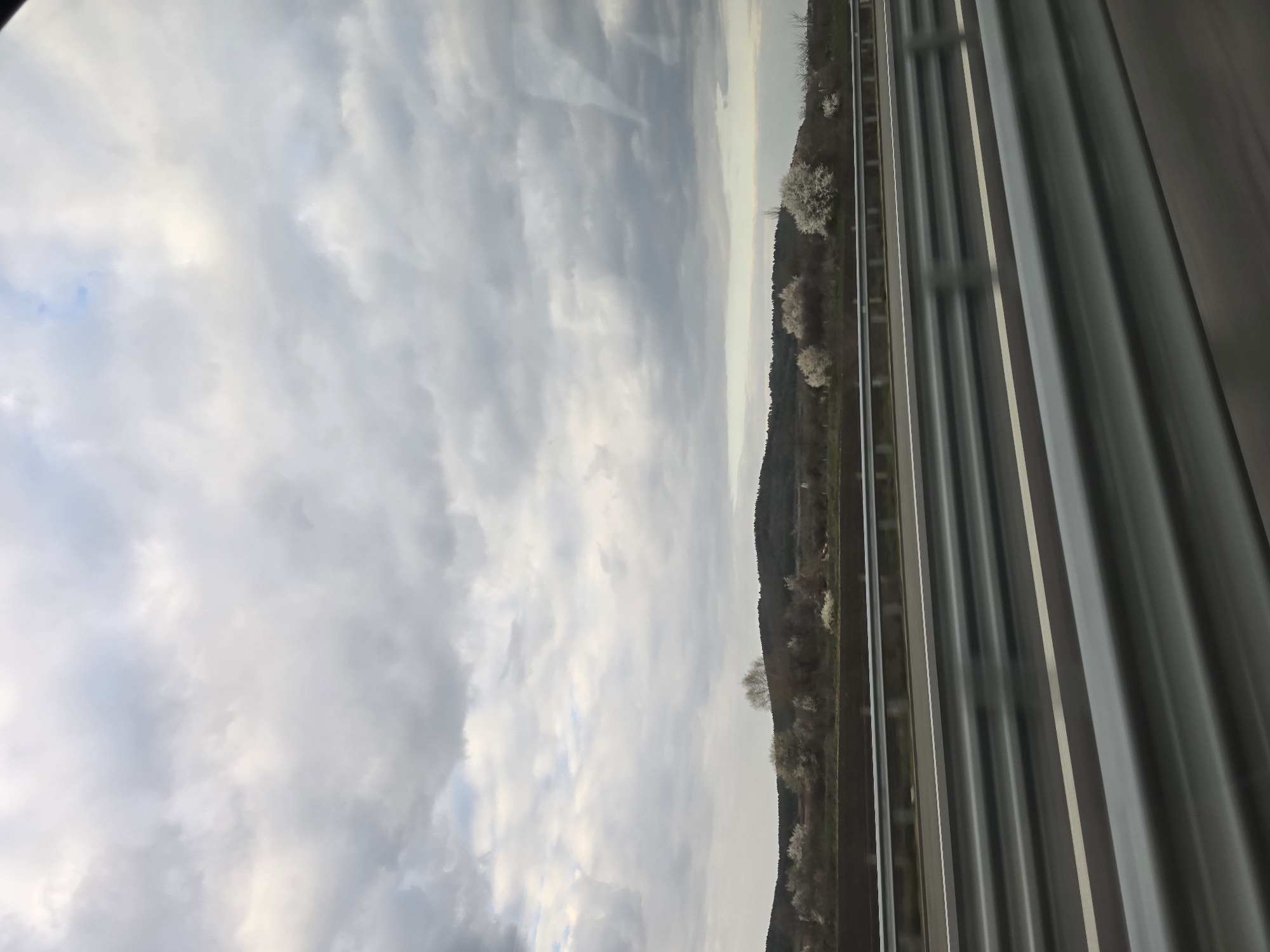 The image displays a roadside scene captured from a moving vehicle on a multi-lane highway in the city of Kaloyanovets, Bulgaria. In the foreground, a prominent silver metal guardrail with multiple horizontal rails stretches across the lower portion of the frame, exhibiting significant horizontal motion blur. Beyond the guardrail, a dark grey asphalt road with a single white lane marking is visible, also showing signs of motion. The midground features a flat agricultural landscape with sections of tilled earth and scattered deciduous trees. Several of these trees are densely covered in white blossoms, indicating a spring season. In the background, a range of undulating hills, predominantly covered in dark green or brown vegetation, extends across the horizon. The sky above is entirely overcast, filled with thick, grey-white clouds, with only faint hints of brighter light or blue sky peeking through in isolated spots. No individuals, animals, or specific actions are discernible within the frame.