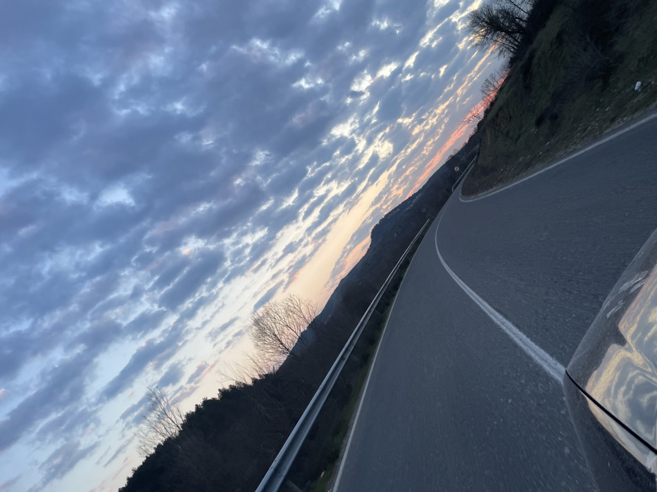 The image depicts an asphalt road curving to the right, observed from a low angle, consistent with a perspective from a vehicle, at either sunrise or sunset in Drianova Glava, Bulgaria