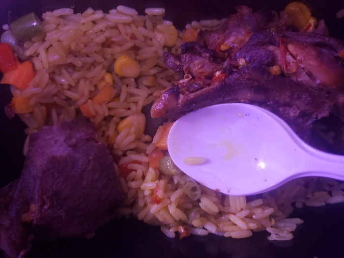 - "The scene depicts a close-up overhead view of a prepared meal contained within a dark vessel, possibly a take-out container, located in Okpanam, Nigeria" by FM-vXzHq2, licensed under CC BY 4.0