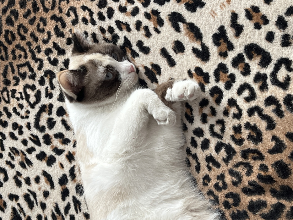 A domestic cat is observed lying on a leopard-print surface in Votkinsk, Russia. The cat possesses white fur across its body, with distinctive dark brown coloration on its ears, around its eyes, and on its nose and lower legs/paws. Its eyes are blue, and its nose is pink. The animal is positioned on its left side, with its head resting on the surface, looking towards the right side of the frame. Its front paws are tucked, with the visible right paw appearing to gently hold or rest upon a small, dark brown object. The leopard-print surface features irregular black and brown spots against a light tan background.