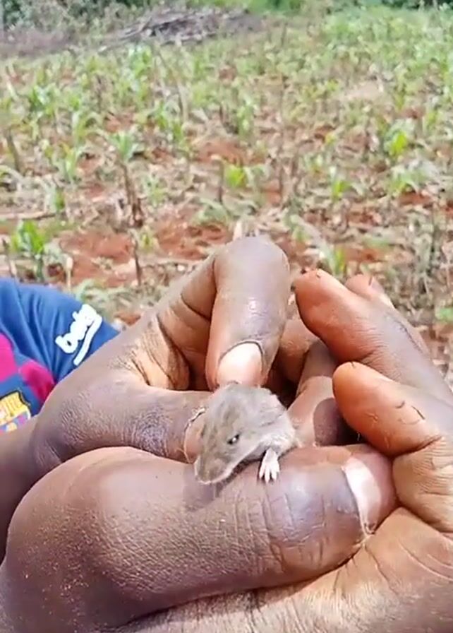A person holds a small, gray mouse cupped in their hands. The hands are dark-skinned, and the mouse is facing the camera with its small paws visible. The background shows a field with rows of young plants, possibly corn, in red soil. A portion of a blue and red t-shirt is visible on the left side of the frame. The scene appears to be outdoors in a rural or agricultural setting. Music is playing in the background.