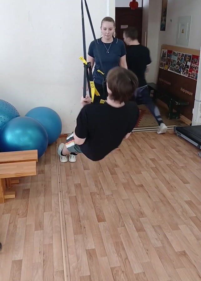 A high-angle shot shows a person using suspension training straps in a gym setting. The individual, wearing a black shirt and shorts, is positioned on the floor, legs bent, holding onto the straps. A woman, dressed in a blue top, is standing nearby, seemingly supervising. In the background, there are blue exercise balls, a wooden bench, and another person walking towards an open doorway. The gym has a wooden floor and white walls. The general atmosphere suggests a supervised workout session.