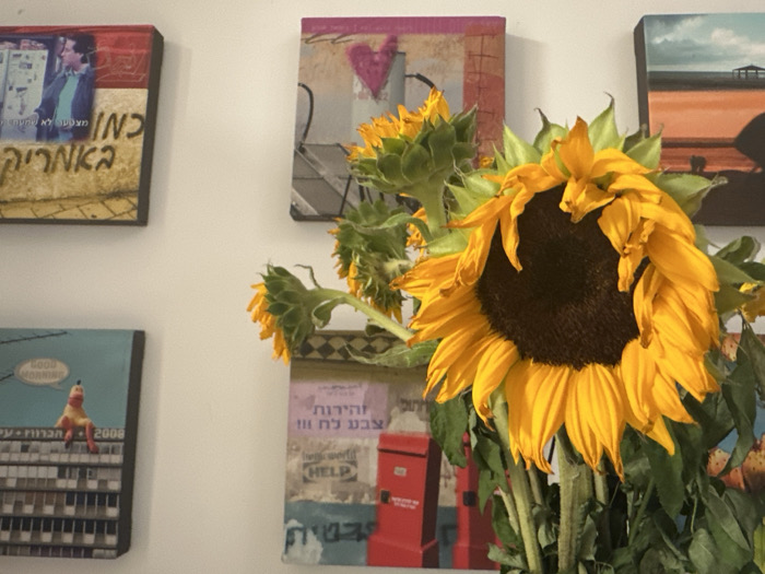The image displays a bouquet of sunflowers with vibrant yellow petals and dark brown centers, one prominent bloom slightly wilted, positioned in the foreground and occupying the right side of the frame. The sunflowers are set against a plain white wall serving as a display for several rectangular mixed-media artworks. The artworks include: * **Top Left:** Features a man in a blue shirt over a street scene, with Hebrew text reading "כח מאחורי בארץ" (Power behind in the country) and "מצטער לא פה" (Sorry, not here). * **Top Middle (partially obscured):** Shows a pink heart graphic over an urban background. * **Top Right (partially obscured):** Depicts a landscape or seascape with an orange sky/water and a dark silhouette. * **Bottom Left:** Illustrates a multi-story building, characteristic of International Style architecture common in Tel Aviv, with a red cartoonish figure on its roof. Text includes "GOOD MORNING" in a speech bubble and "2008". Partially visible Hebrew text reads "החברות". * **Bottom Middle (partially obscured):** Displays two red public mailboxes, typical of Israel Post, against a textured background. Visible text includes Hebrew "זהירות צבע טח וו!!!" (Caution: Paint Wet!!!) and English "help world" and "HELP". The presence of Hebrew text, the distinctive architecture resembling Tel Aviv's International Style buildings, and the characteristic red Israeli mailboxes on the artworks indicate the location is in the city of Tel Aviv, Israel. The scene appears to be an indoor setting, likely a home or art studio.