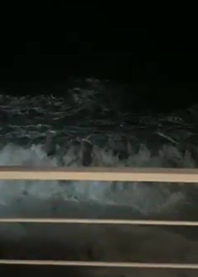 dark beach at night with large, powerful waves crashing onto the shore. The camera is positioned behind a white railing, likely a balcony or deck overlooking the beach. The waves are turbulent, with white foam visible against the dark water. The night sky is completely dark, offering no visible landmarks or horizon.