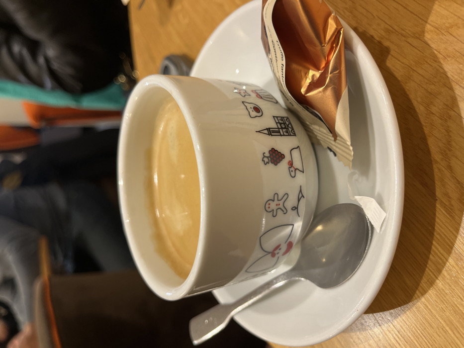 - "A white ceramic espresso cup containing coffee with a light brown crema is centered on a white saucer" by FM-eWTi73, licensed under CC BY 4.0