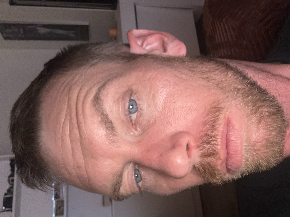 A close-up image shows a fair-skinned man's face. He has light brown hair and a beard of the same color, with a reddish tint. His eyes are a striking blue. The man has prominent forehead wrinkles and appears to be either naturally flushed or slightly sunburned. The background is blurred, but some furniture or shelving is visible. The photo is rotated, placing his ear at the top of the frame.