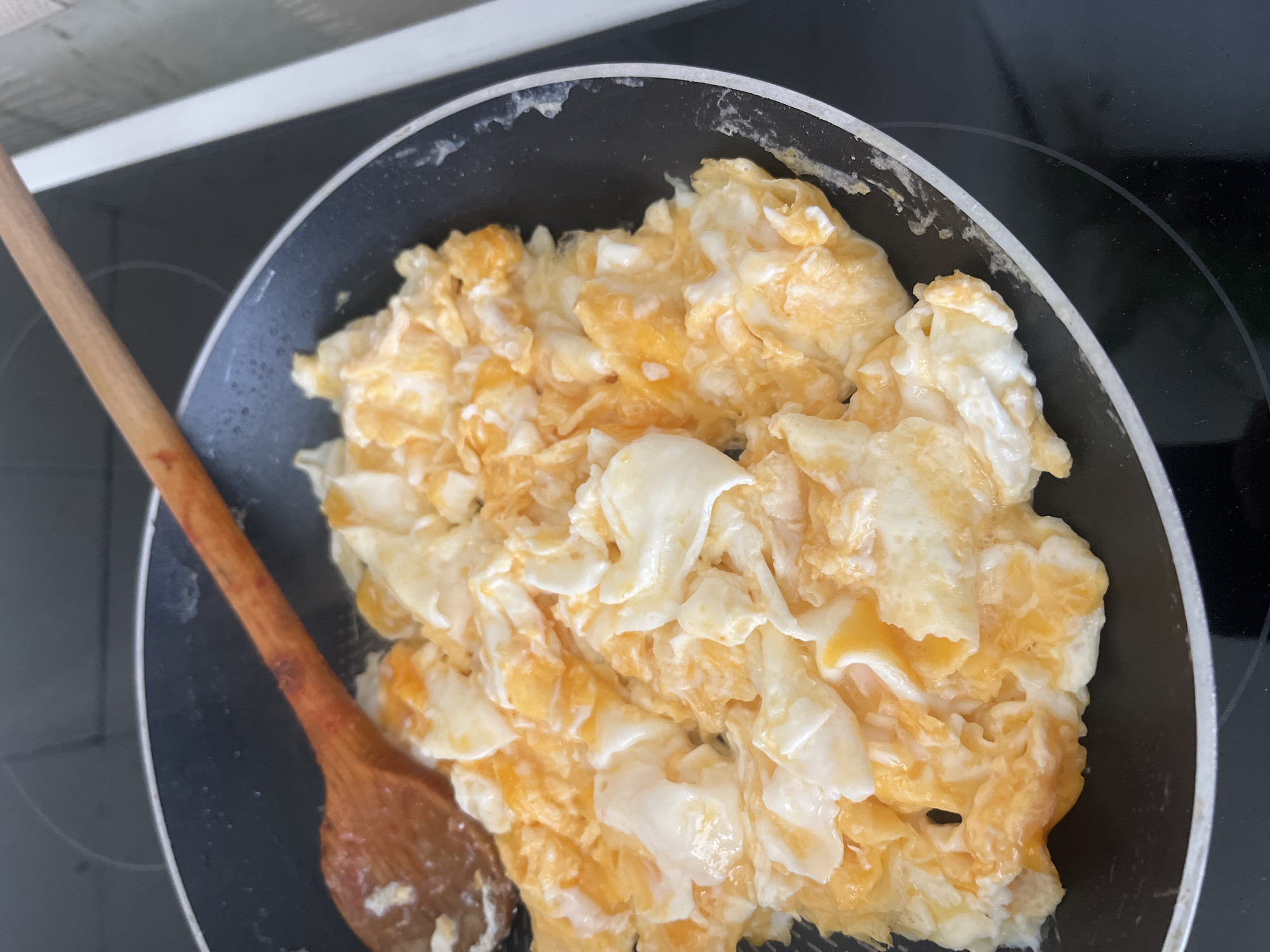 A top-down shot depicts scrambled eggs in a black non-stick frying pan with a wooden spoon resting inside, positioned on a black induction stovetop