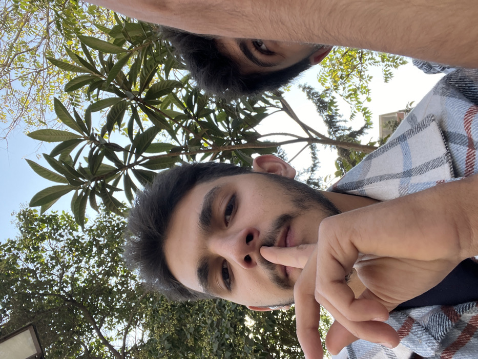 This image, captured in Al-Qanawat Municipality, Syria, displays two males in an outdoor setting, viewed from a low angle. The prominent subject, a young adult male with dark hair, a mustache, and a short beard, is positioned centrally. He is looking directly at the camera with his right index finger pressed vertically against his lips, executing a "shush" gesture. He wears a light-colored plaid jacket featuring blue, white, and reddish-brown squares over a dark inner garment. To his right, a second male is partially visible, showing the top of his head with dark, curly hair and his right eye looking upwards and to the viewer's left. A section of a tan, hairy arm occupies the right edge of the frame, partially obscuring the second individual. The background consists of verdant tree foliage, including a large-leafed tree prominent in the upper right, against a clear blue sky. A light-colored structural element is faintly visible behind the primary subject's right shoulder.