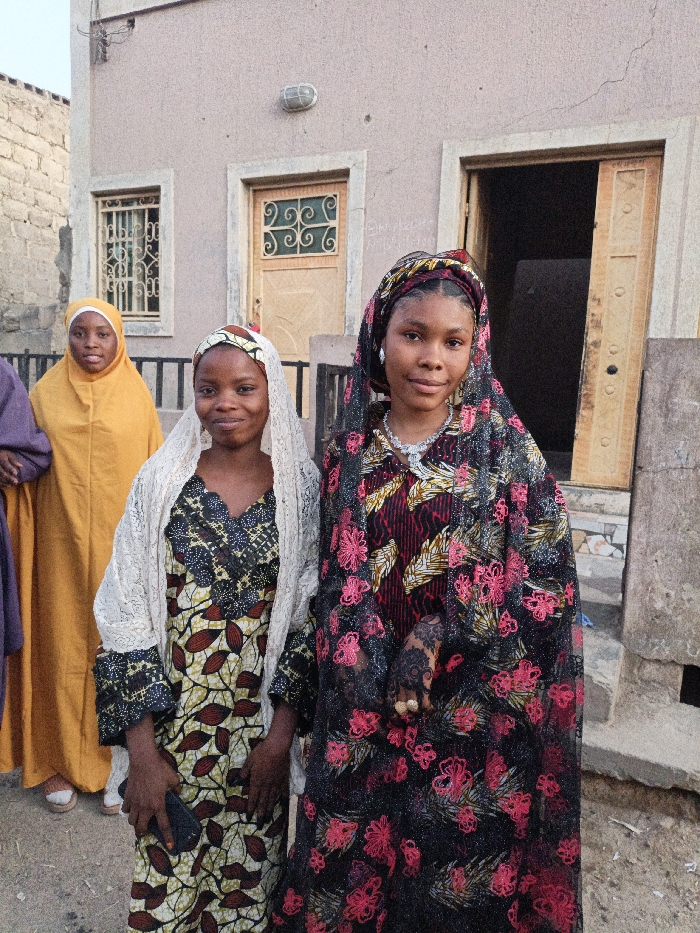 Three girls are pictured outdoors, likely in front of a residence. One girl wears a yellow hijab and matching dress. Another is dressed in a patterned gown, draped with a white lace shawl and holding a smartphone. The third girl dons a black embroidered dress with red flowers, head covering, and a prominent necklace. Henna designs adorn her hand. The building in the background has two doors and a barred window.