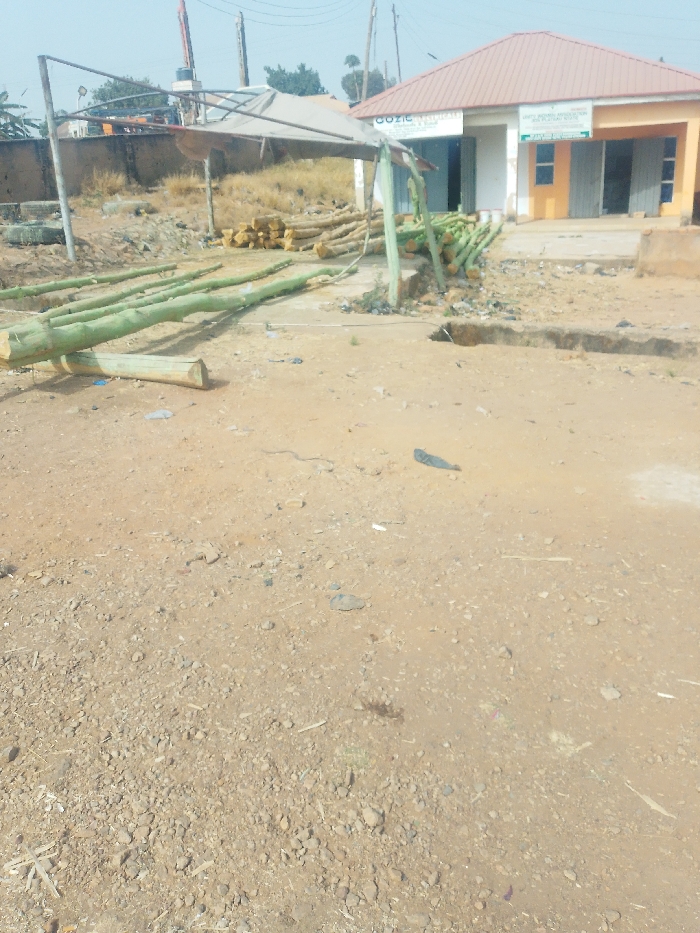 The image displays an outdoor scene in Jos, Nigeria, featuring a predominantly unpaved, light-brown dirt and gravel ground with scattered debris. In the midground, numerous debarked logs, some exhibiting a light green hue suggesting freshness, are distributed horizontally on the ground. To the left, a dismantled metal frame structure, possibly a canopy or shed, with a light-colored fabric draped over a section, stands near a pile of yellowish-brown logs. To the right, a single-story building with a reddish-brown hip roof and light-colored walls is visible. This building features two doorways on its right side, each framed by distinctive orange-painted sections. An elevated concrete platform extends across the front of the building. Two signs are mounted on the building's facade: a partially legible sign on the left identifies "GOZIE GLOBAL COMMUNICATION & BUSINESS CENTRE," while a sign on the right reads "BEYOND NATIONAL ASSOCIATION OF PLATEAU YOUTHS." The background reveals indistinct architectural structures, utility poles, and overhead power lines against a bright, hazy sky. No individuals are present, and no specific actions are observed within the frame. The scene presents an open commercial or storage area.