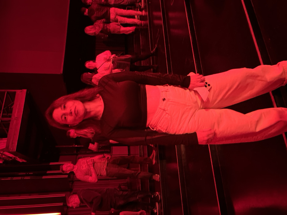 The scene depicts an indoor performance or event venue, identifiable as **CUK Kino Šiška** in Ljubljana, Slovenia, characterized by its tiered floor levels and overhead rigging. The entire environment is illuminated by a strong, pervasive red light. In the foreground, a female subject stands centrally, facing the camera with a neutral expression. She has long, dark hair. Her attire consists of a black, long-sleeved crop top and light-colored, baggy jeans, which appear reddish-orange under the dominant red lighting. Her midriff is exposed. She holds a light-colored smartphone, equipped with a multi-lens camera array, in her left hand, which rests at her side. Several other individuals are visible in the blurred background. To the left, a man wearing a light-colored t-shirt and dark pants stands, holding a drink. Further left, another partially obscured individual is present. To the right, a group of people is visible, mostly out of focus, standing on the tiered levels. One woman in this group wears a light-colored top and dark lower garments. The environment features dark, multi-level platforms or steps forming the floor. Vertical structures, possibly lighting elements or supports, are present on the left side of the frame. An industrial-style metal structure, consistent with stage rigging or a catwalk, is visible in the upper left background. The background walls are dark, absorbing much of the light. No explicit interactions between individuals are discernible.