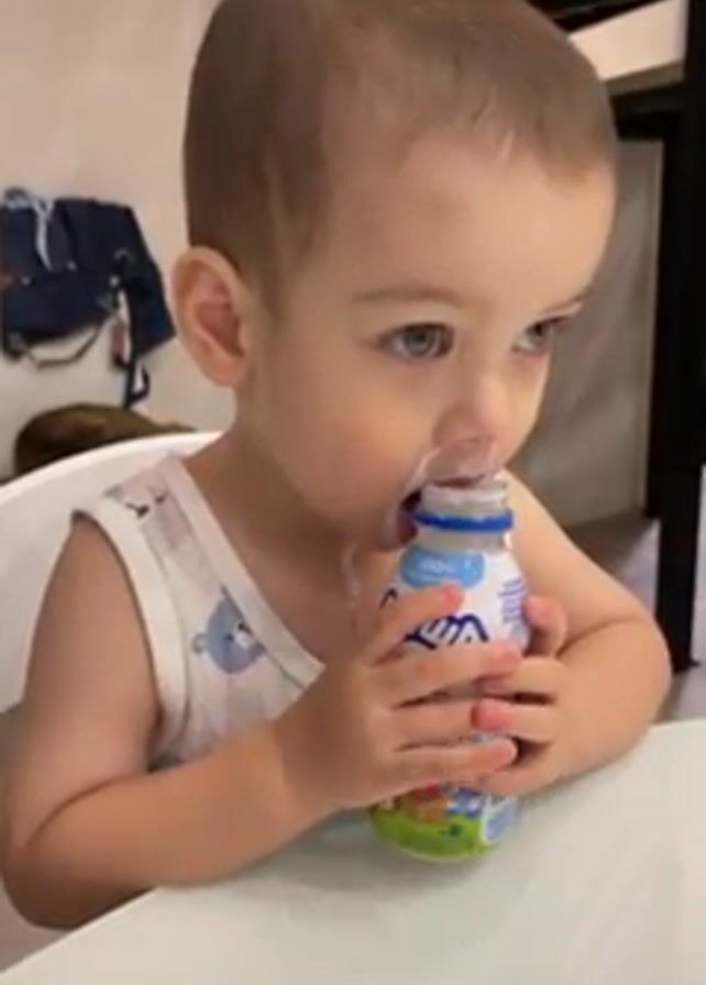 A toddler drinks from a small bottle of "Agusha" yogurt, wearing a white tank top with a blue bear print