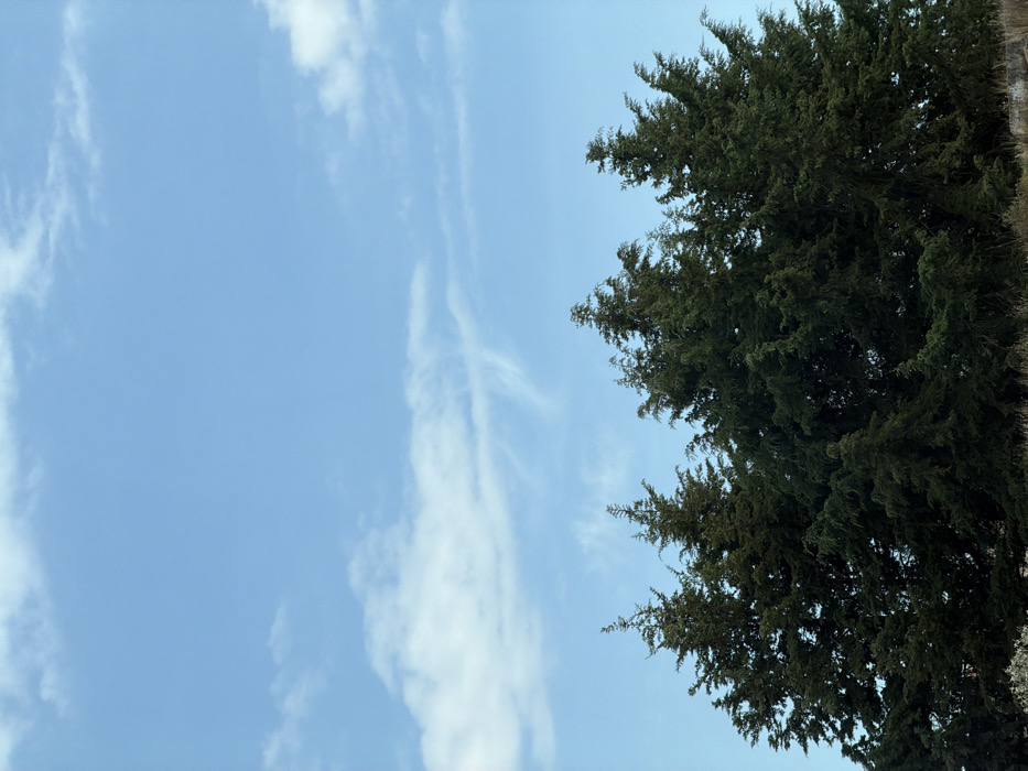 A bright blue sky spans the majority of the scene, adorned with wispy white clouds. On the right side, a dense, dark green evergreen tree dominates a portion of the frame. The tree's foliage is full and textured, contrasting against the smooth expanse of the sky. The overall impression is of a peaceful, natural scene.