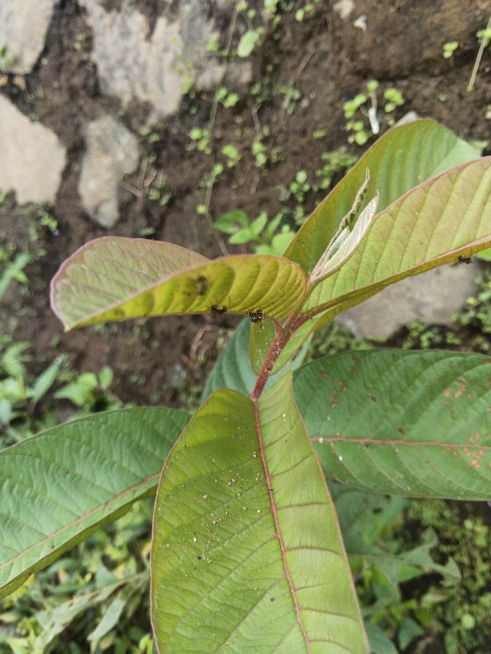 A young guava plant displays vibrant green leaves with prominent reddish veins and hints of yellow near the edges