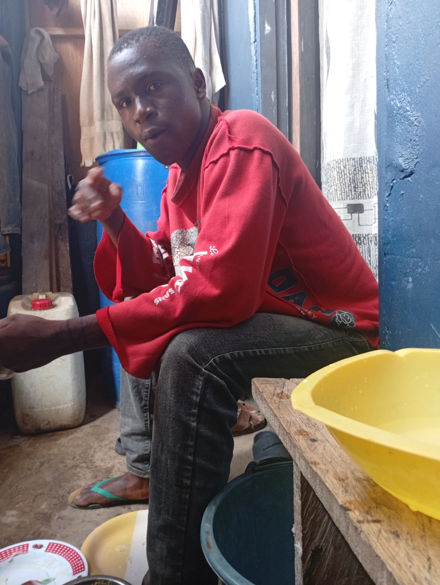 man sitting on a wooden bench inside what appears to be a simple, possibly indoor, setting in Owerri, Nigeria. He is wearing a red long-sleeved shirt and dark jeans. A blue plastic barrel stands behind him. A white plastic container with a red lid is to his left. There are several bowls nearby, including a yellow one on the bench next to him and a patterned plate on the floor. The setting seems informal and perhaps residential.
