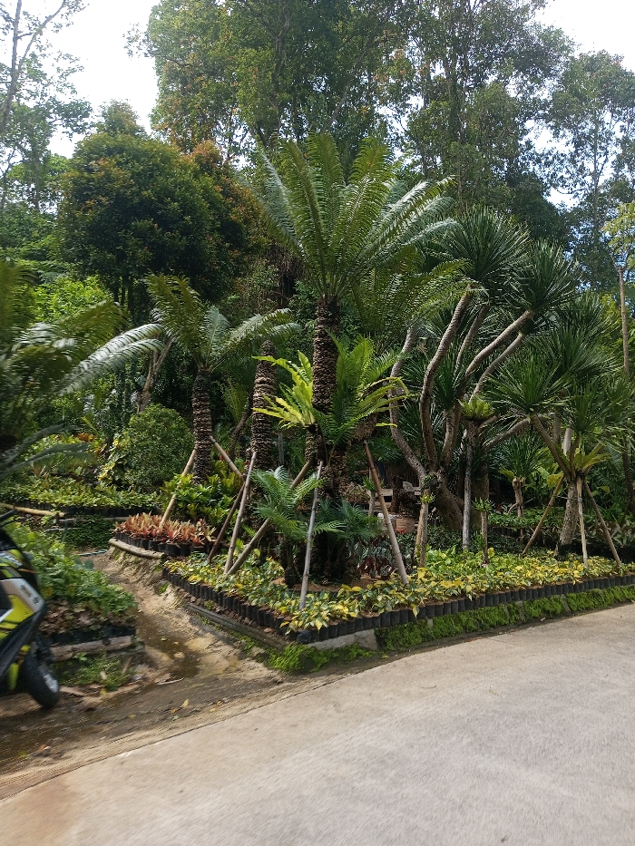 A lush tropical garden scene unfolds with an array of green plants. Several palm-like cycads stand tall, some supported by wooden braces. Low-lying plants in black plastic containers line the edges of the garden beds, with additional plants filling the spaces between the trees. A paved road runs along the foreground, and dense foliage forms the backdrop, indicating a thriving ecosystem. A portion of a motorcycle is visible on the left, adding a sense of scale and activity.