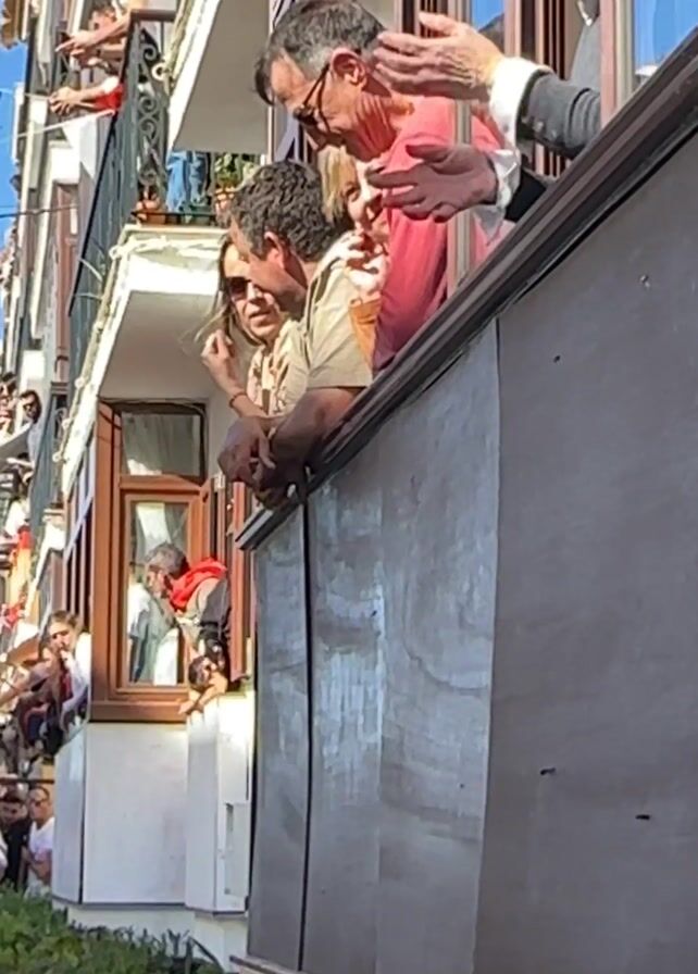 From a low angle, a person in a suit stands on a balcony with two others, greeting a crowd below