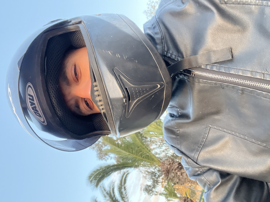 A close-up, low-angle image depicts an individual wearing a black full-face motorcycle helmet and a black leather jacket
