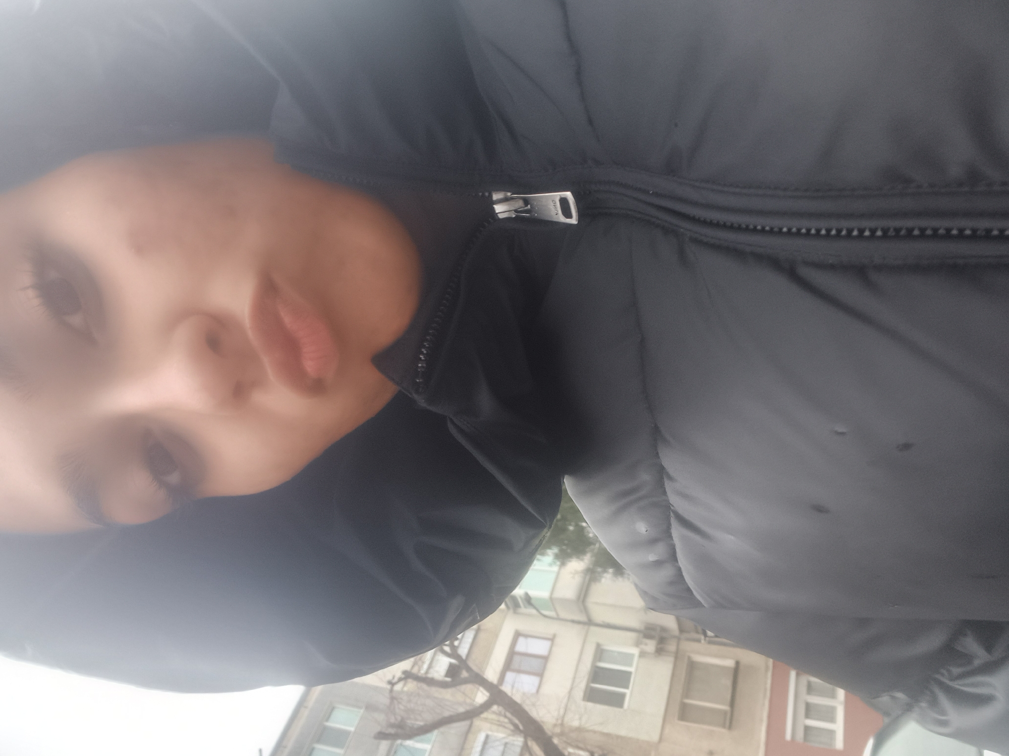 A low-angle selfie photograph shows a person wearing a black, hooded puffer jacket. The hood is pulled up, partially obscuring the face. The person's face is angled to the left, with visible features including eyes, nose, and lips. Behind the person, out of focus, is a building with multiple windows. A bare tree branch is also visible. The photograph was taken outdoors, possibly in Gorna Oryahovitsa, Bulgaria. The sky appears overcast.