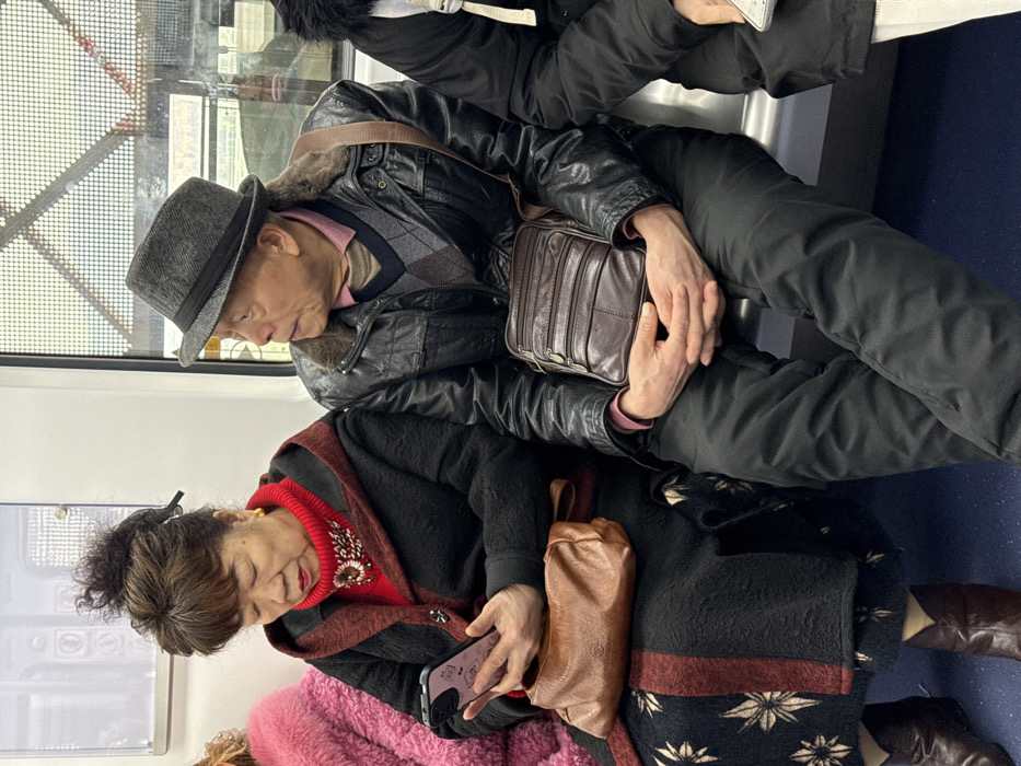 An elderly couple is seen sitting together on public transport. The man wears a fedora, leather jacket, and carries a brown bag. He rests his hands on the bag, seemingly sleeping or dozing. The woman wears a red sweater, dark coat with floral design, and is using a smartphone. A brown leather pouch rests beside her phone. They both appear relaxed and comfortable during their journey.