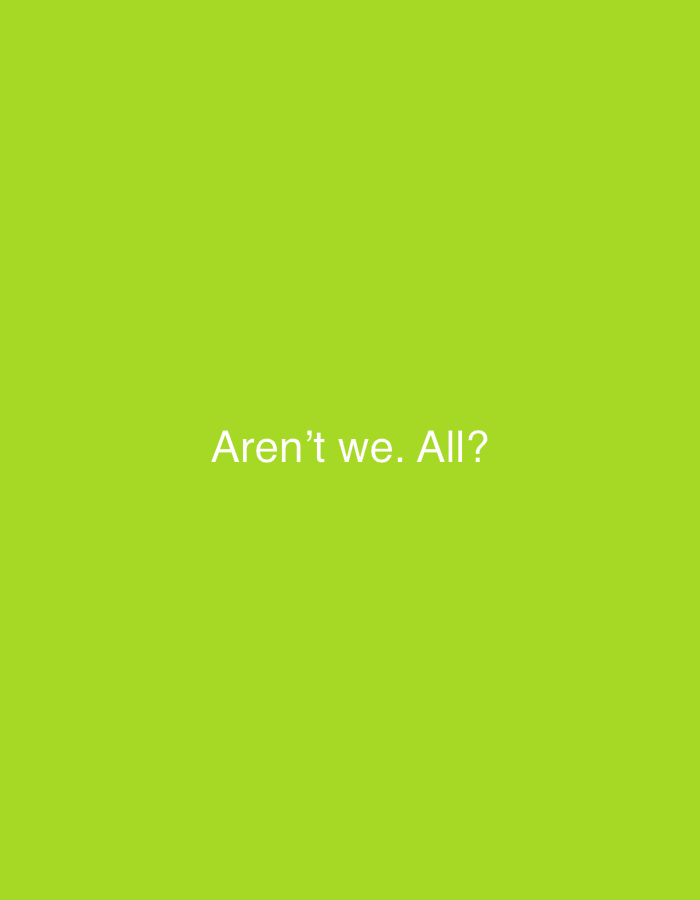 The image displays a uniform lime green background. White, sans-serif text, "Aren't we. All?", is centrally positioned within the frame. No physical location identifiable as being within the city of Milan, Italy, is depicted. The scene contains no discernible individuals, tangible objects beyond the textual elements, actions, or direct interactions; the environment is an abstract color field.