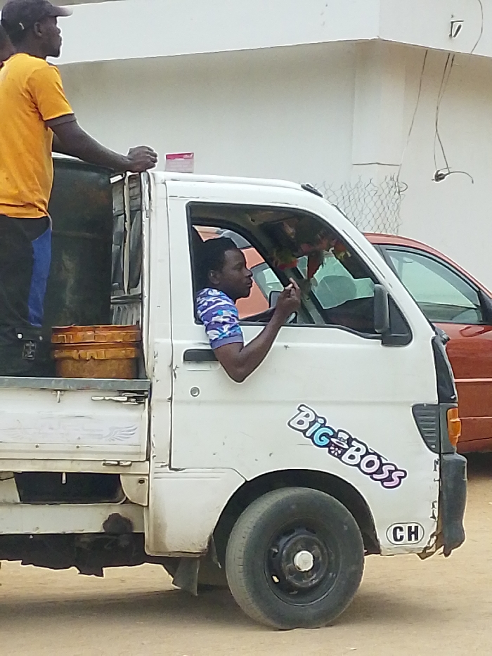 This image, taken in Hotoro South, Nigeria, depicts a white pick-up truck with two adult males