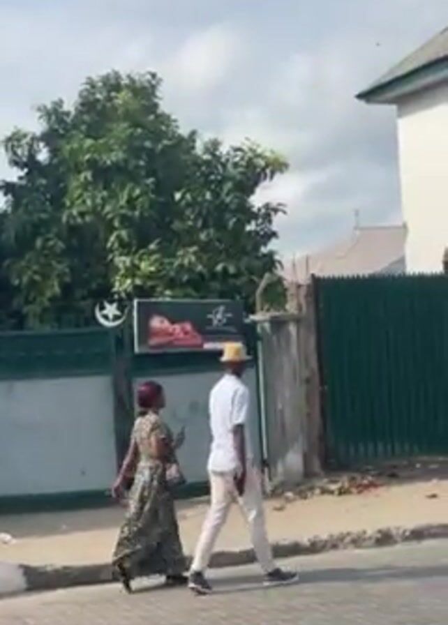 A man and a woman are walking on a sidewalk next to a street. The woman is wearing a long, patterned dress and a head covering. The man is wearing a white shirt, beige pants, and a straw hat. They are walking side by side, and the woman appears to be talking to the man. They walk past a green corrugated fence. Next to it is a sign with a picture of a baby on it. There is a tree on the other side of the fence. The sky is cloudy, and there is a building visible in the background. The road is cobbled.