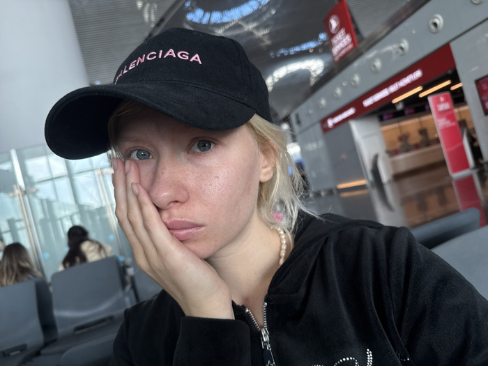 A blonde-haired individual with light blue eyes and visible freckles is depicted in a medium shot, looking directly at the camera. The individual wears a black baseball cap with "BALENCIAGA" embroidered in pink letters on the front, a black zippered hoodie, and a pearl necklace. Their right hand rests against their right cheek. The scene is located in a public waiting area of Istanbul Airport, Arnavutköy, Turkey. In the blurred background to the left, two other individuals are partially visible, seated on grey airport-style benches. To the right in the background, red and white signage for "TURKISH AIRLINES" and "BİLET SATIŞ NOKTASI" (Ticket Sales Point) is clearly discernible, alongside other generic red airport signage. The environment features large glass windows, a high ceiling, and a polished, reflective floor surface.