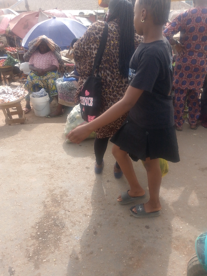 The image depicts an active outdoor market scene in Jos, Nigeria, under bright daylight. The ground is a light-colored, dusty pavement. In the foreground, a young girl is seen from her left side, walking towards the right. She wears a black short-sleeved t-shirt, a black pleated skirt, and grey slip-on sandals. A small gold-colored hoop earring is visible in her left ear. Her left arm extends downward towards a white mesh bag filled with light-colored produce, positioned on the ground. Behind the girl, an adult woman stands with her back to the viewer. She wears a brown and black leopard-print long-sleeved garment over dark leggings and blue and brown shoes with heels. Her hair is styled in long, dark braids. A black shoulder bag, adorned with pink hearts and the word "PRINCE" in pink text, hangs from her left shoulder. She is positioned near the white mesh bag of produce. Further into the background, on the left, a seated female vendor is visible. She wears a light pink top and a multi-colored patterned wrapper. A patterned cloth covers her head. She sits behind a low wooden stall displaying goods, including dried fish on a wooden tray and a white plastic bucket. Behind her stall, piles of red-orange produce, likely tomatoes, are visible. In the far background, multiple market umbrellas in shades of blue and reddish-orange provide shade over various indistinct stalls and items. A partially visible individual in a blue and brown patterned traditional garment stands on the far right. Shadows are cast by the figures, indicating strong overhead light.