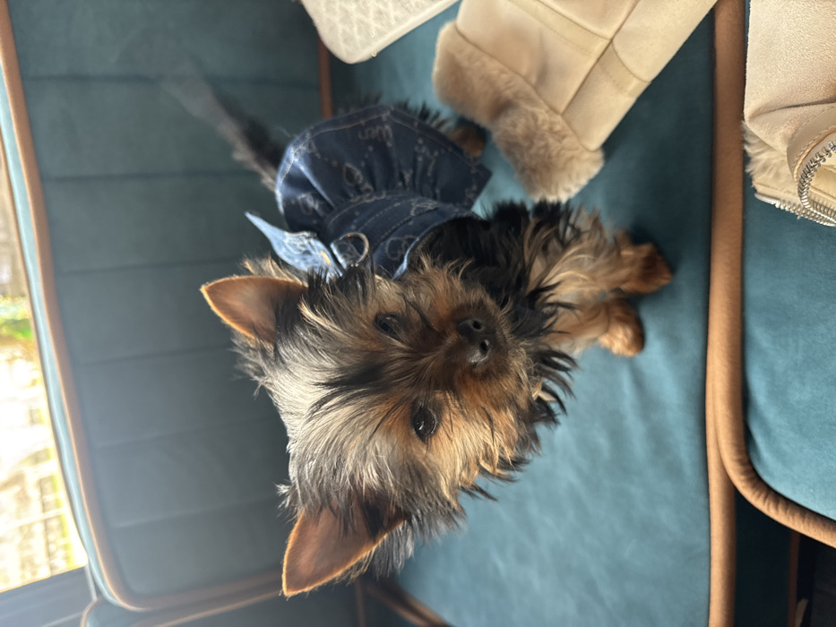 - "A Yorkshire Terrier, displaying black and tan fur, stands on a teal-colored upholstered bench with light brown piping" by FM-wBqTU2, licensed under CC BY 4.0